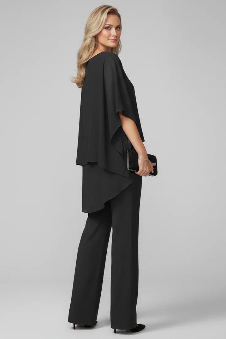This women’s off-shoulder flowing wide-leg jumpsuit delivers effortless elegance with a modern, statement silhouette. Designed with a softly draped off-shoulder neckline and layered flowing top detail, it creates graceful movement while maintaining a refined structure. Perfect for evening occasions, formal gatherings, and winter celebrations, it combines sophistication with contemporary charm.